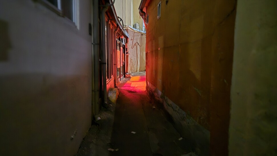 지난 12일 저녁 8시15분께 가로등 불빛도 닿지 않는 어두운 골목 끝에서 빨간 불빛이 흘러나왔다. 한두 사람이 겨우 지나갈 정도의 골목은 얽히고설켜 마치 미로 같았다. 골목은 깊어질수록 좁고 어두웠다. 오래된 단층 건물들의 담벼락은 성한 데 없이 부서졌다. 떨어진 벽돌이 바닥에 나뒹굴어도 보이지 않았다. 골목을 따라 이어진 수십여개의 낡은 가게 가운데 몇몇이 드문드문 붉은 전등을 켜고 영업을 알렸다.